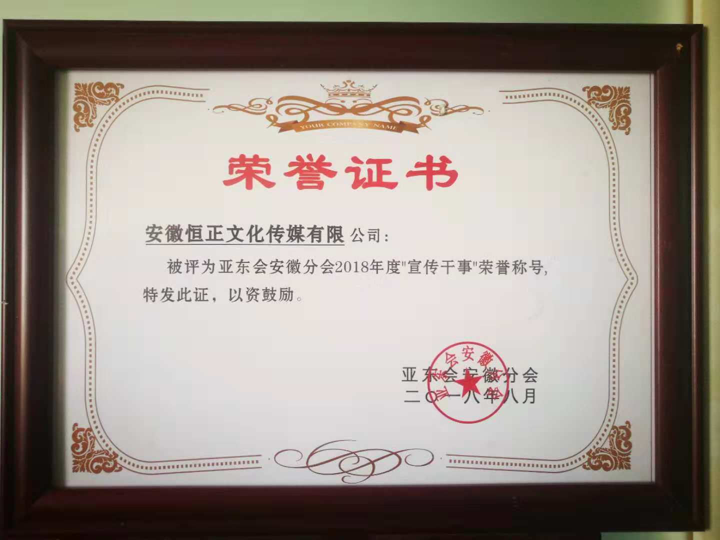 证书颁发:安徽恒正文化传媒有限公司获得亚东会安徽分会会员单位、亚东会安徽分会2018年杰出贡献奖、亚东会安徽分会宣传部干事、亚东会安徽分会综合管理部成员等等。感谢亚东会安徽分会对恒正传媒的支持与信任。